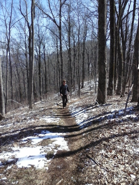 We both slept well and got up, had breakfast, and were not the last to hit the trail for the day. We had an easy 10 miles before we got to Albert Mountain, which was a hard climb. There was also no wind, a nice change. In the morning, we walked over what was once mud, but now is frozen concrete with the impressions of the boots of hikers in front of us. We leave no footprints of our own this morning. The trail alternates between this frozen mud on which you have good traction, and layers of compacted snow turned to ice, on which you have no traction. We pass through rhododendron thickets, which provide cover and allow the snow to linger. All in all, the nice weather this morning overcame any issues with the trail.
